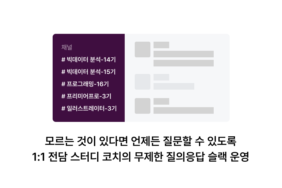 패스트캠퍼스에서는 끝까지 완주할 수 있도록 수강 기간 동안 궁금한 내용을 언제든 질문할 수 있는 슬랙을 운영합니다. 스터디 코치에게 궁금한 점을 무제한으로 물어보세요!