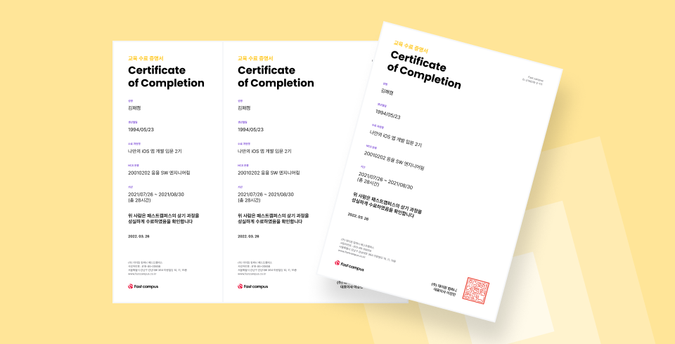 강의를 80% 이상 수료 시, 국가공인 NCS 코드가 부여된 인증서를 발급합니다. 공기업 지원시 가산점이 부여됩니다.